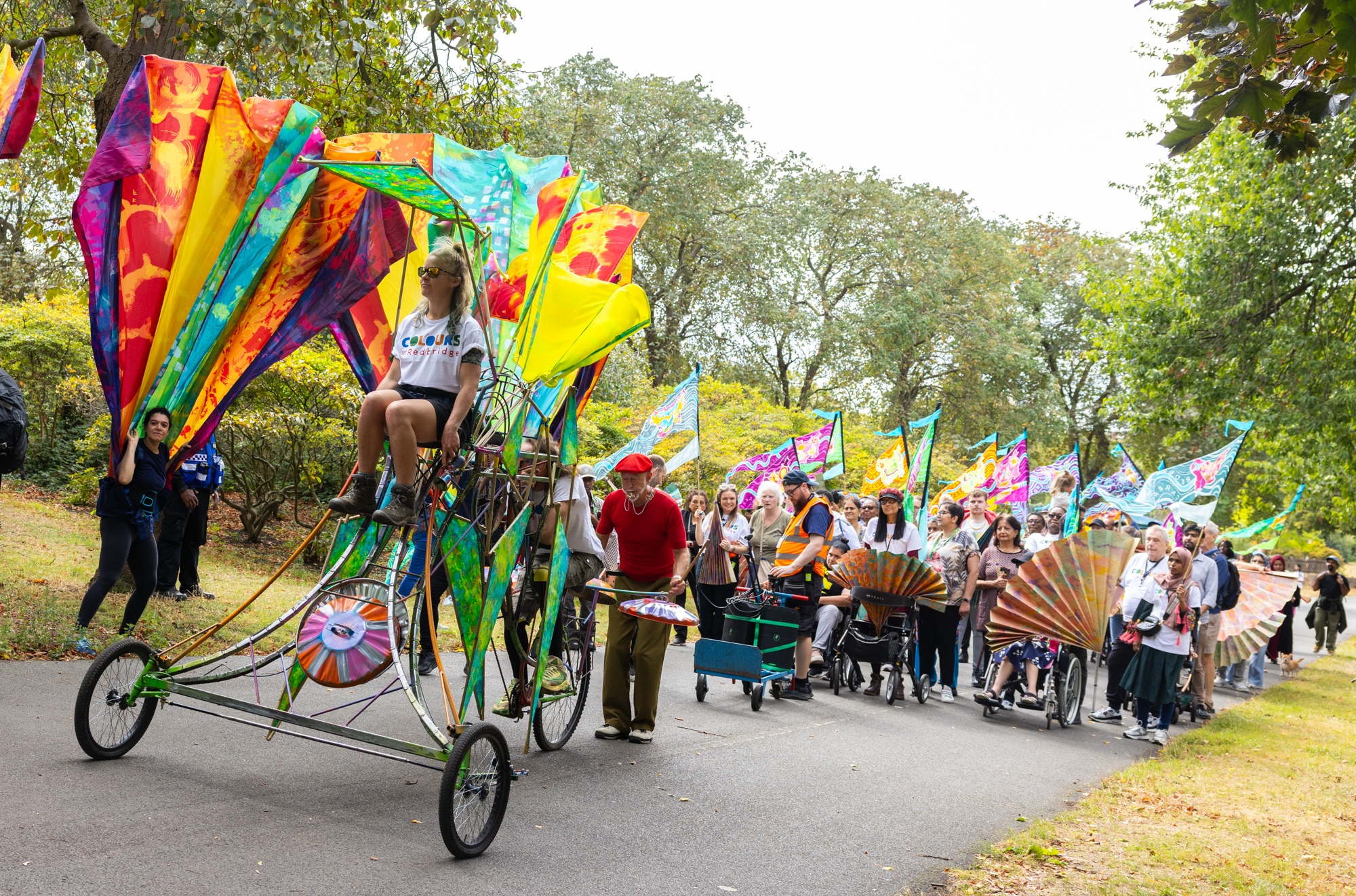 Celebrating local communities that champion access and wellbeing, artists from Kinetika delivered creative workshops where community members designed colourful flags representing their organisations. These designs were all brought together for an inclusive street parade, led by live music and each flag held by their makers as they danced through Valentine’s Park on a sunny bank holiday.