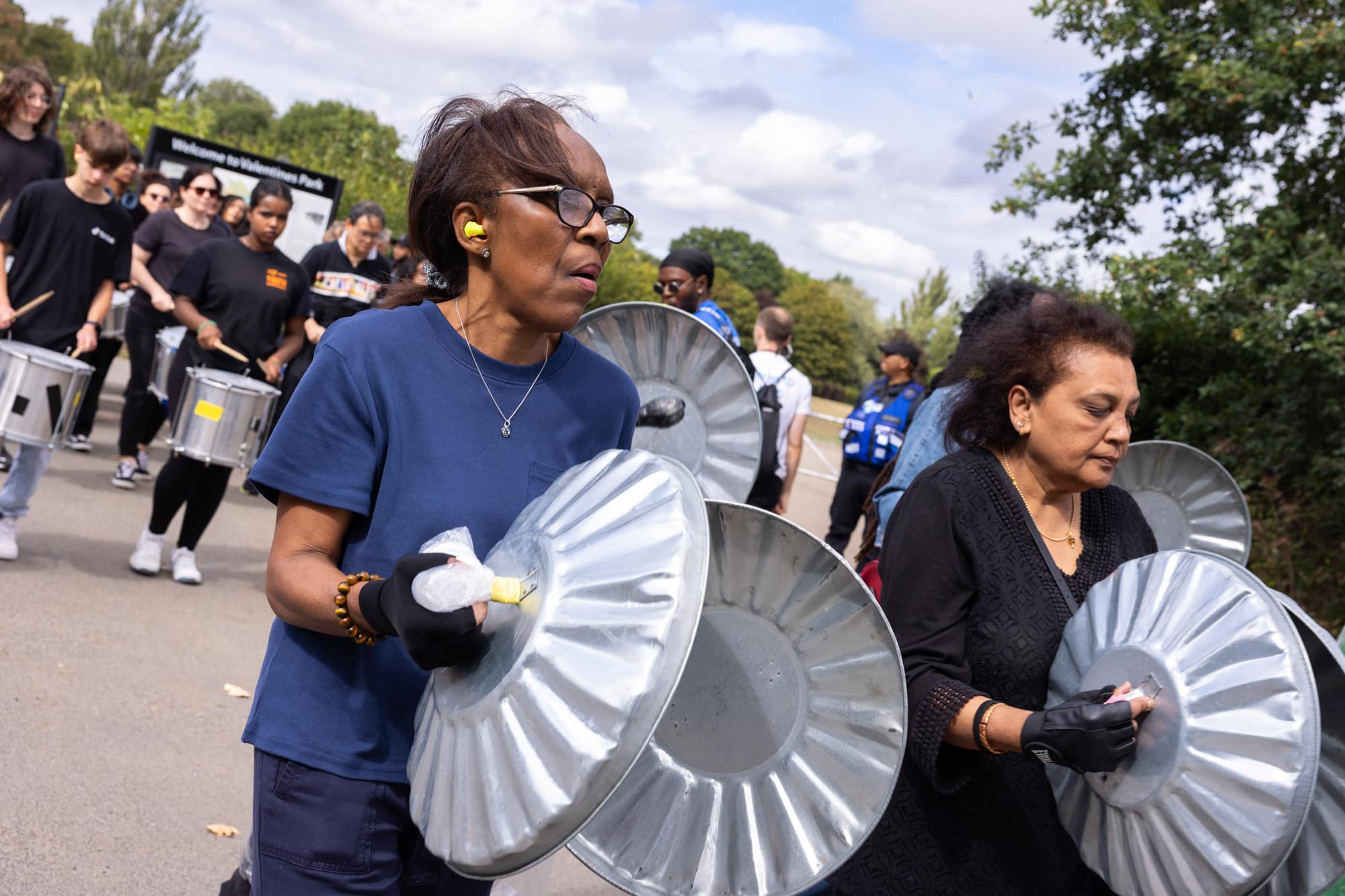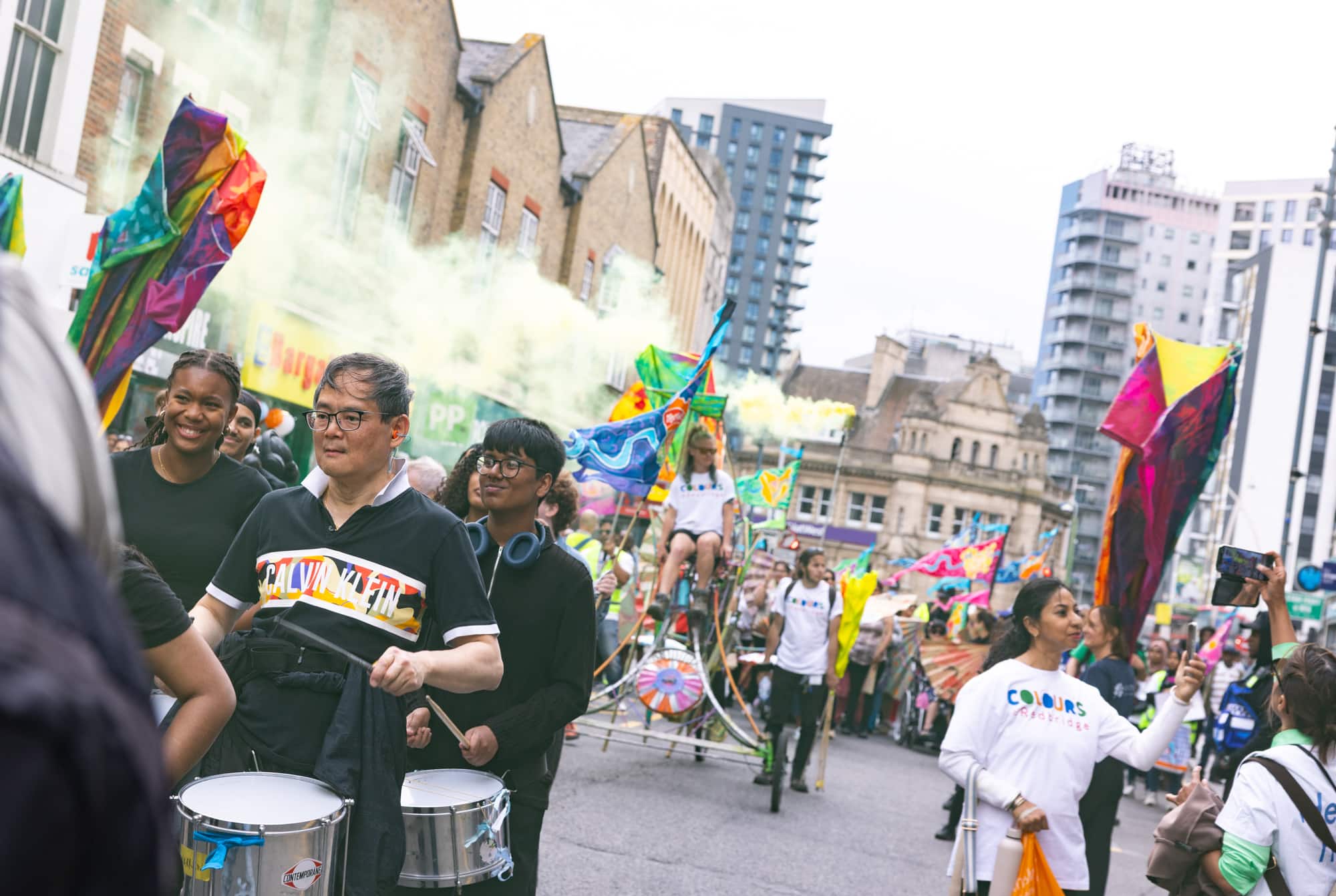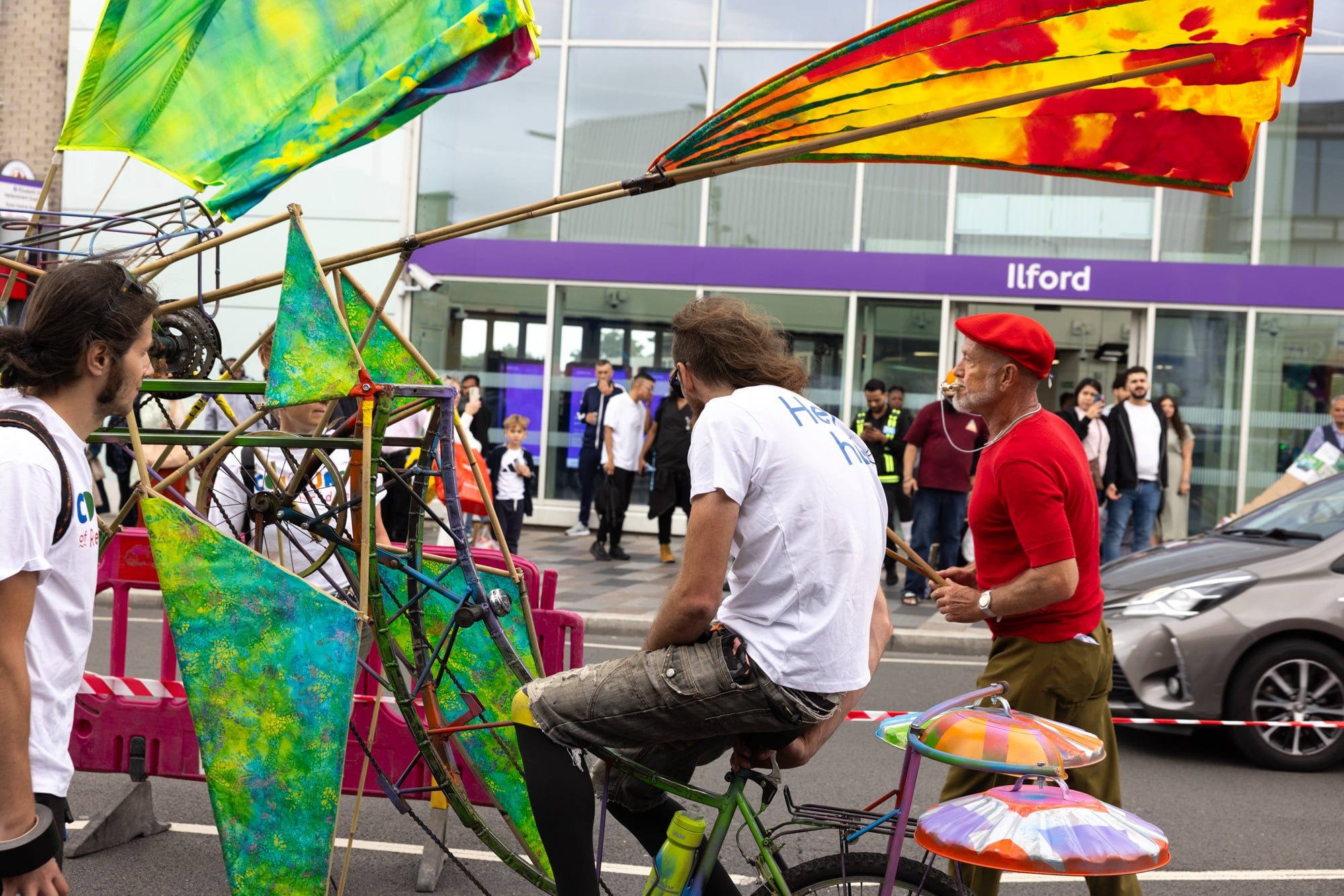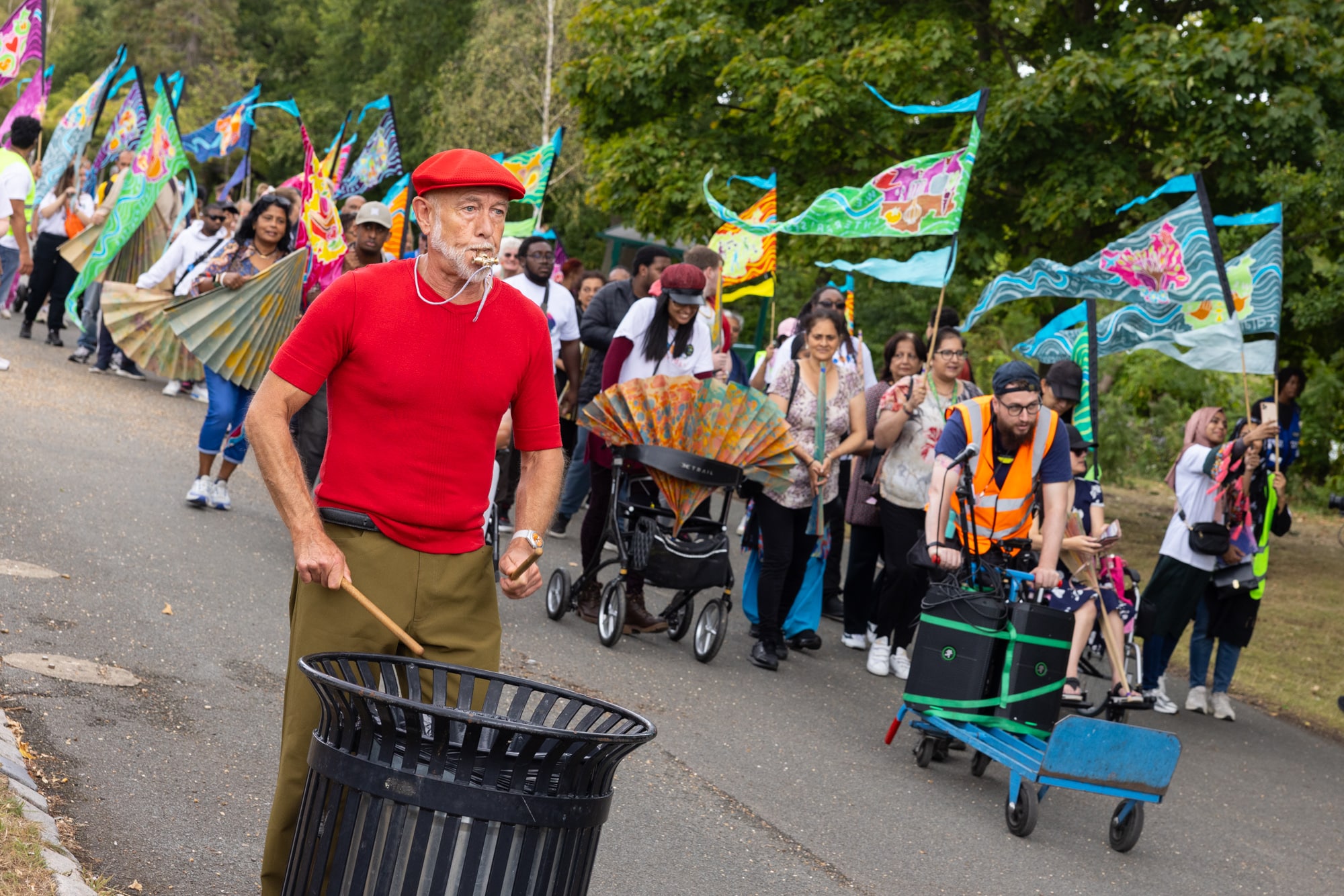 The Big Small Wonders parade was the opening event of Colours of Redbridge’s Other Worlds programme in August 2025. It featured dozens of local community members, some carrying fans and flags they had designed, and some forming a street percussion band of vibrant samba drums and rediscovered objects. The parade brought together different artists from the UK and abroad including international phenomenon, STOMP!